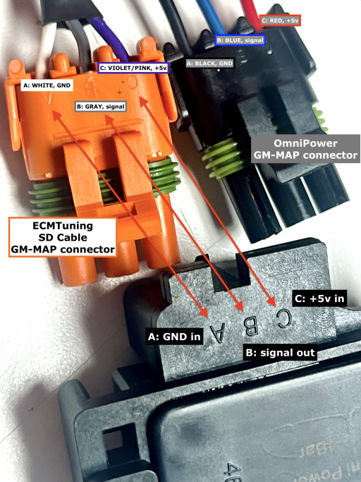 NOTE 2: As of 20251019, Documentation on the pin-out of the Omni 4-bar MAP sensor is very confusing on the web because so many places are posting flat out *WRONG* information and it's starting to spread. So the image below is intended to answer once and for all what the pins map to.